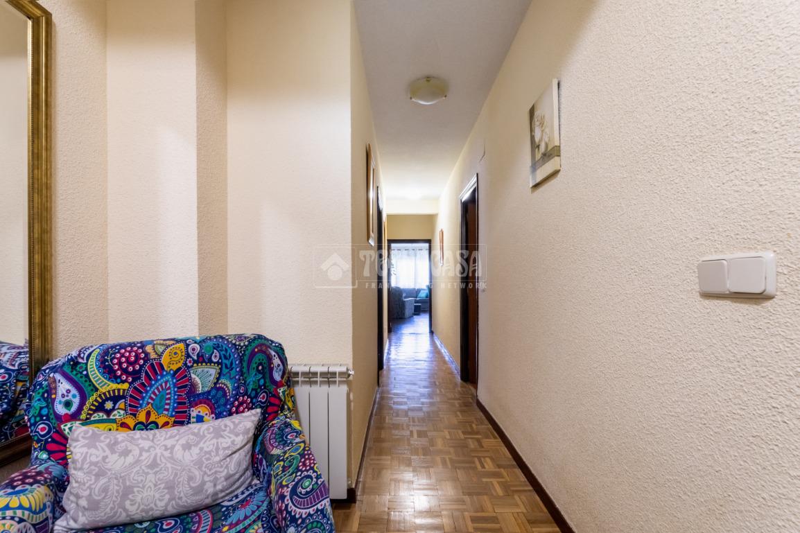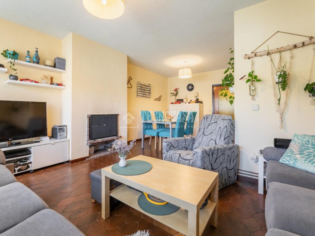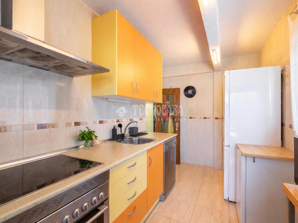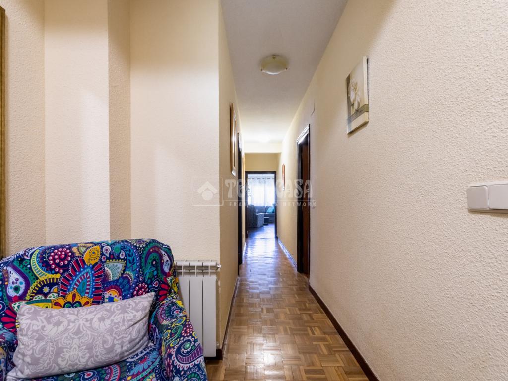 De frente, otro pasillo conduce al resto de la vivienda, donde se encuentra el dormitorio principal, de amplias dimensiones y con acceso directo a una de las terrazas. En esta zona se ubican también un segundo baño completo con plato de ducha, una cocina independiente completamente equipada con salida a terraza, y un espacioso y luminoso salón-comedor con chimenea, desde el que se accede a una tercera terraza.